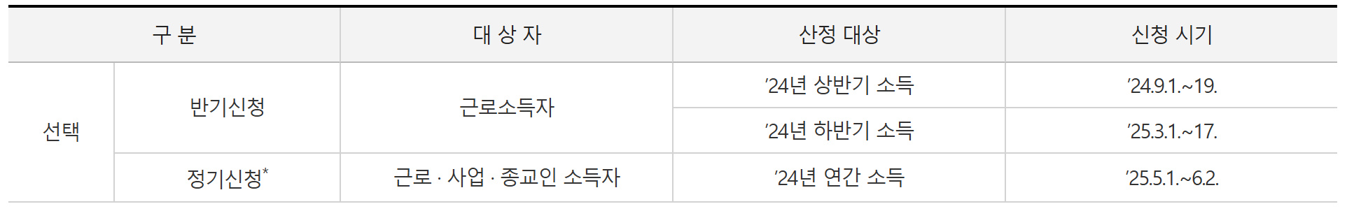 근로소득만 있는 자는 반기신청과 정기신청을 선택하여 신청 할 수 있고, 사업 또는 종교인 소득이 있는 자는 정기신청을 해야 합니다.